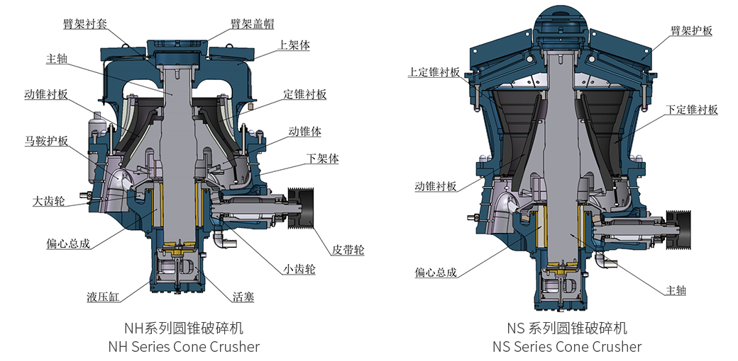 電機(jī)經(jīng)由大小齒輪帶動(dòng)偏心套組件旋轉(zhuǎn),由偏心套組件迫使主軸以懸掛點(diǎn)為中心,繞機(jī)器中心線旋擺運(yùn)動(dòng)。動(dòng)錐的運(yùn)行軌跡看起來是在破碎腔內(nèi)來回?cái)[動(dòng),同時(shí)緩慢的旋轉(zhuǎn)。物料被擺動(dòng)的動(dòng)錐擠壓破碎;