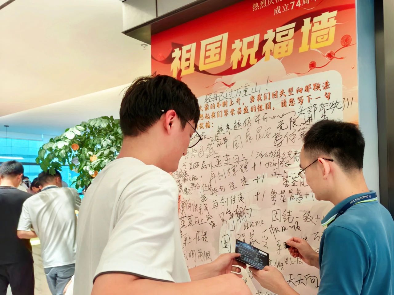 同事們在祖國祝福墻提筆寫下對祖國的美好祝愿或對生活的美好愿景。一句句動人的祝福語,抒發了大家真摯的愛國之情。